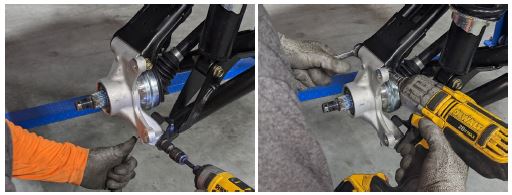 - Attach rear bearing carrier to control arms using provided hardware and 15mm socket and wrench.