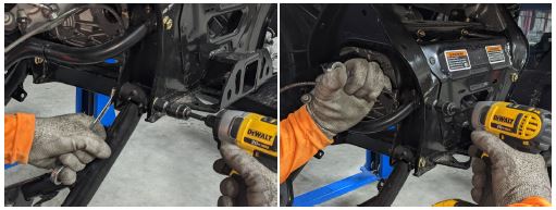Stake the axle nut. - Using a 15mm socket and wrench install shocks and attach to control arms using provided hardware.