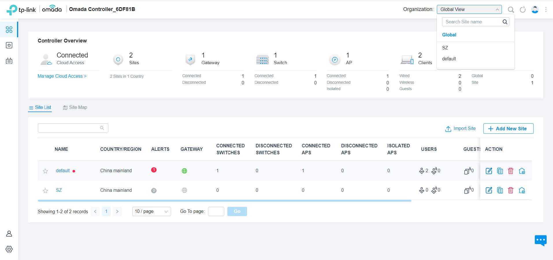 1. In Global view, click Add New Site in the Site List section.