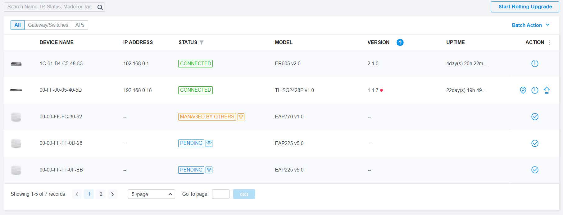 • Click the ACTION column of the devices which you want to add to the site. Wait until the STATUS turns into Connected. Then the devices are adopted by the controller and added to the current site. Once the devices are adopted, they are subject to central management in the site.