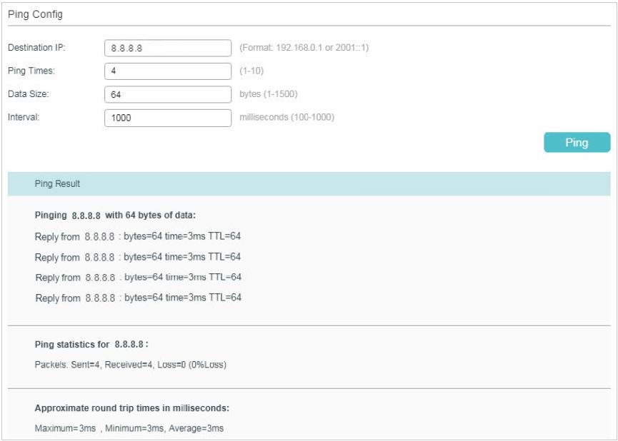 Let’s take a switch for example. Log into the web page of the switch in Standalone Mode. Go to MAINTENANCE > Network Diagnostics > Ping to load the following page. Specify Destination IP as a public IP address, such as 8.8.8.8. Then click Ping.