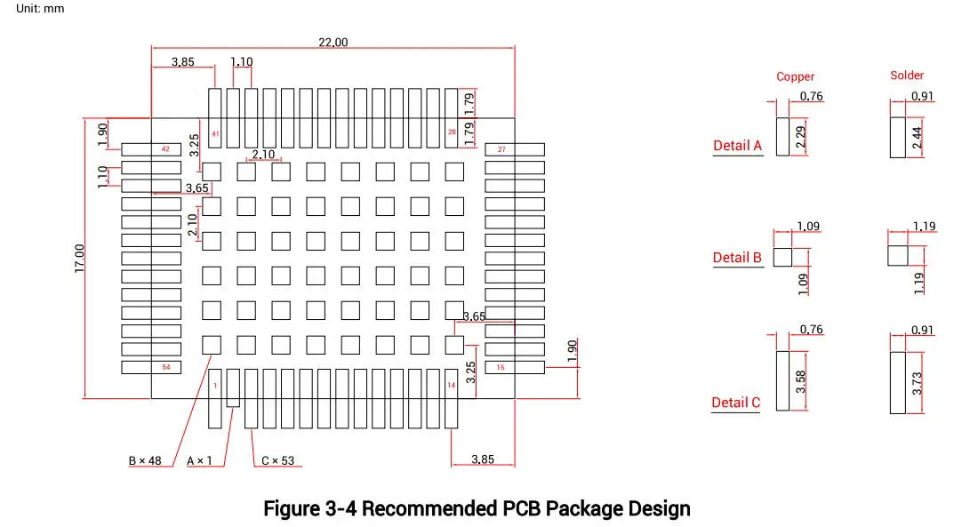 - The pad denoted as detail A is 0.50 mm longer than the module border. It is relatively short as it is an RF pin pad, so we hope the trace on the surface is as short as possible to reduce the impact of external interference on the RF signals.