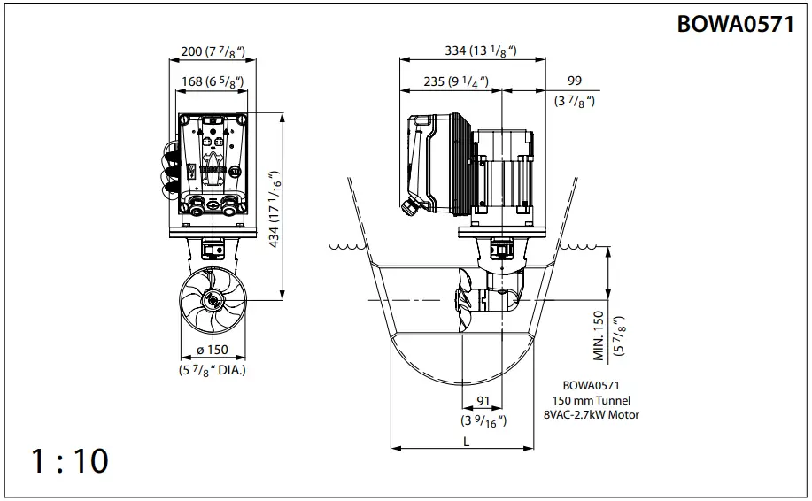 When determining the exact position of the bow thruster in the thrust tunnel, the tailpiece MUST NOT protrude from the tunnel end.The propeller should preferably be situated on the centreline of the vessel, but it must always be accessible from the outside.
