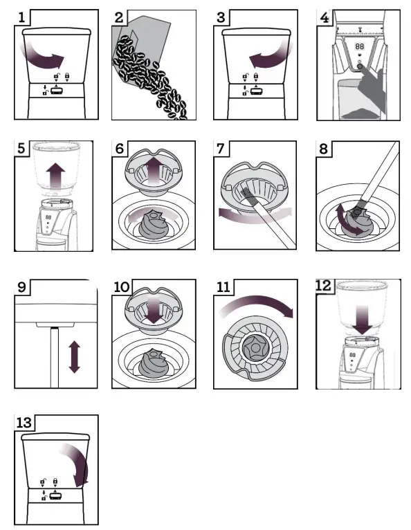 - To remove the upper burr, hold of the upper mill and turn counter clockwise, then raise it vertically to remove.