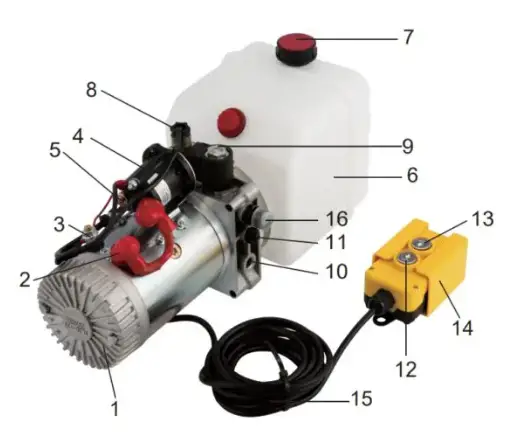 9. Solenoid Valve 10. Iwwerlaf Ventil 11. Drosselventil 12. Up Button 13. Down Knäppchen 14. Pendant Kontroll 15. Kontroll Cord 16. Ueleg Outlet |