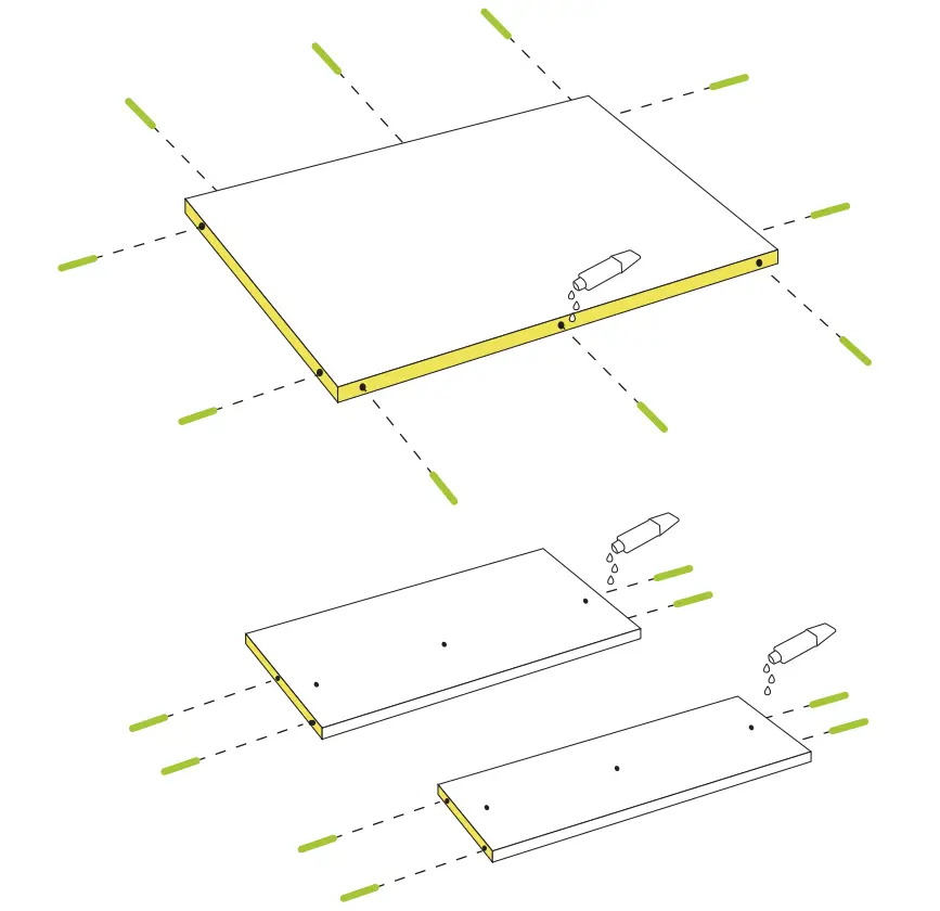- Apply glue in all holes of Front zBoard and Back zBoard. Align Front and Back zBoard to Side zBoard and join to Bottom zBoard as shown.