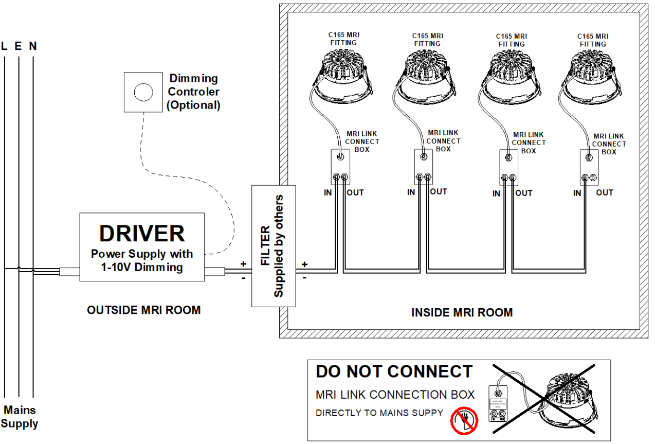 Note that the driver is installed outside the MRI room with Filter bridging into the room (supplied by others) then connecting to the MRI link connection boxes that loop in and loop out to the next fitting. Maximum number of fittings that can be run by driver and maximum circuit length listed below. Maximum Number of fittings that can be run by driver: