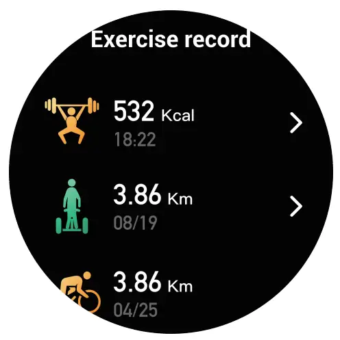 This interface saves your exercise history records of 10 days and allows you to check the data, such as sports duration, heart rate and calories.