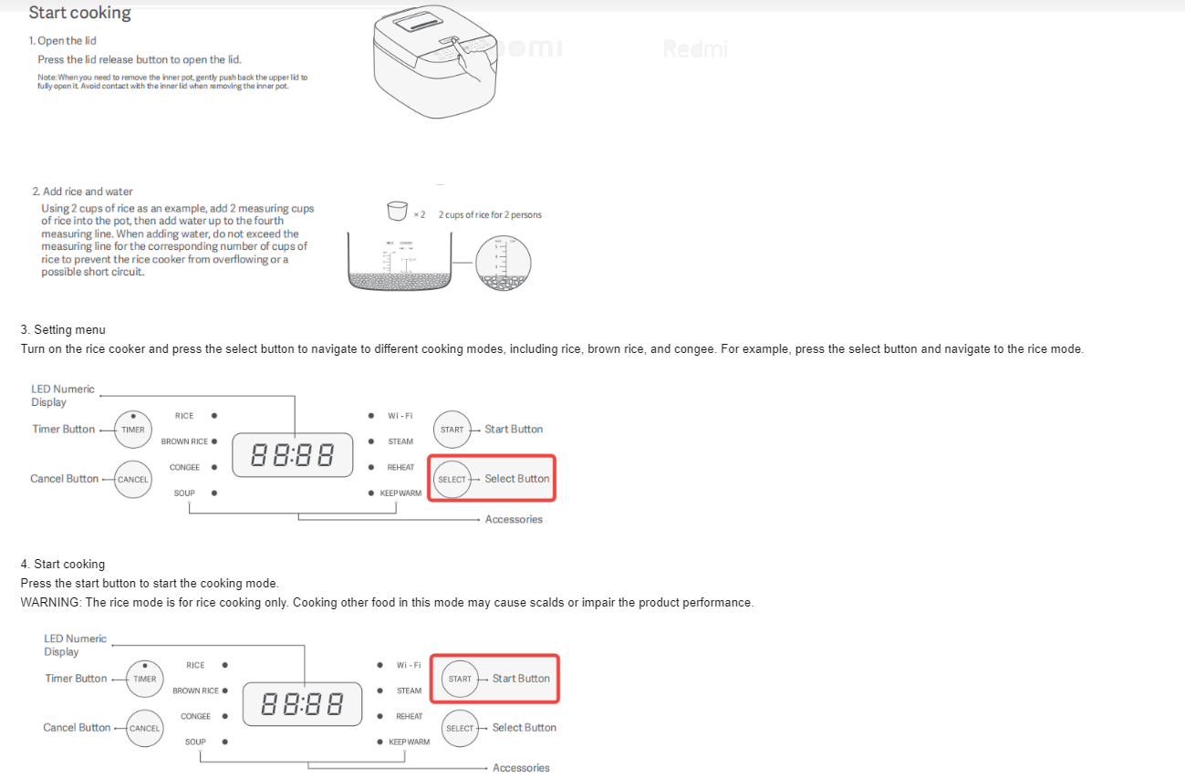 1- Open the lid Press the lid release button to open the lid. Note: When you need to remove the inner pot, gently push back the upper lid to fully open it. Avoid contact with the inner lid when removing the inner pot. 2- Add rice and water Using 2 cups of rice as an example, add 2 measuring cups of rice into the pot, then add water up to the fourth measuring line. When adding water, do not exceed the measuring line for the corresponding number of cups of rice to prevent the rice cooker from overflowing or a possible short circuit. 3- Setting menu Turn on the rice cooker and press the select button to navigate to different cooking modes, including rice, brown rice, and congee. For example, press the select button and navigate to the rice mode. 4- Start cooking Press the start button to start the cooking mode. WARNING: The rice mode is for rice cooking only. Cooking other food in this mode may cause scalds or impair the product performance.