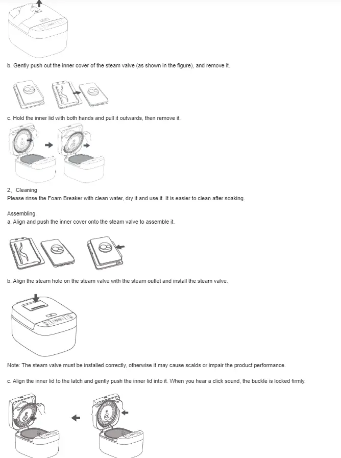 To ensure the hygiene of rice, please remove the inner lid and Foam Breaker for cleaning while cleaning the inner pot. At the same time, clean the inner pot ring of any dirt and standing water in the support ring, Rice Paddle, and Ladle Steamer should also be cleaned after use.