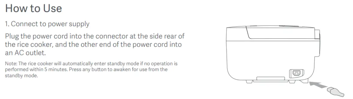 inner pot scale is divided into the cooking scale and congee scale (note: the scale line is the water level line, the scale number indicates the number of cups of rice) Cooking scale: Using 2 cups of rice as an example, add 2 measuring cups of rice into the pot, then add water up to the second measuring line. When adding water, do not exceed the measuring line for the corresponding number of cups of rice to prevent the rice cooker from overflowing or a possible short circuit. Congee scale: Using 1 cup of rice as an example, add 1 measuring cup of rice into the pot, then add water up to the first measuring line. When adding water, do not exceed the measuring line for the corresponding number of cups of rice to prevent the rice cooker from overflowing or a possible short circuit.