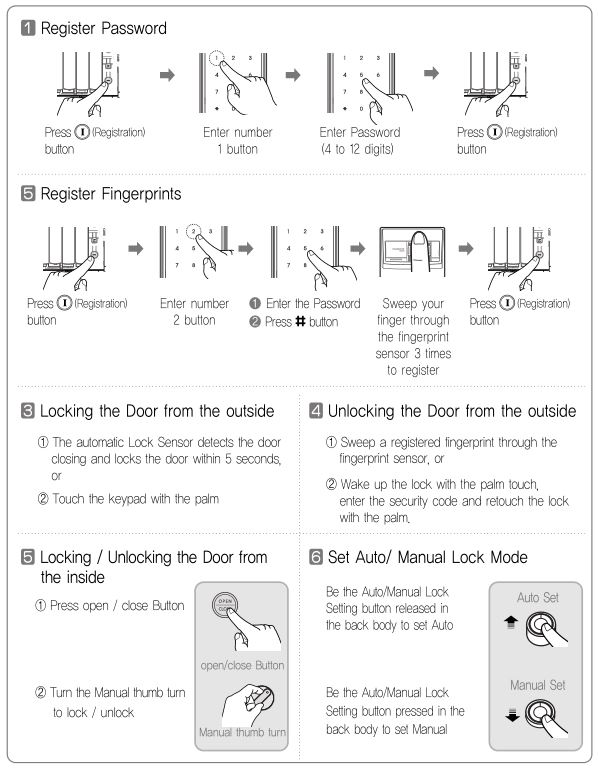 - If more than 1 fingerprint is registered after the Security Mode is set, you may not open a door only with a (If the fingerprint module is broken, you may use a Password.)
