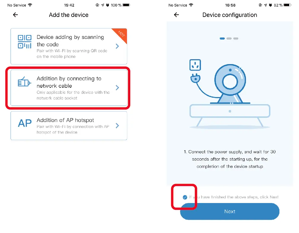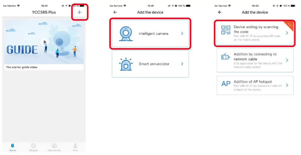 Before adding the camera, make sure your router is 2.4G Wi-Fi and your phone is connected to 2.4G Wi-Fi. Then, you can either scan the code to add the camera, add it by connection to a network cable, or add it via AP hotspot.