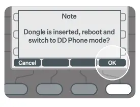Once the dongle is attached and the phone is powered, you will see a message on screen that reads “Dongle is inserted, reboot and switch to DD phone mode?” Press the OK soft key. The phone will display “Searching for base” and then come online.