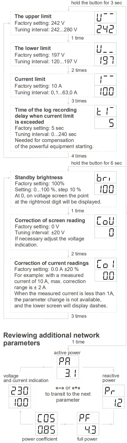 | Current limit (if exceeded, a log entry will be made) | 0,1–63 А |